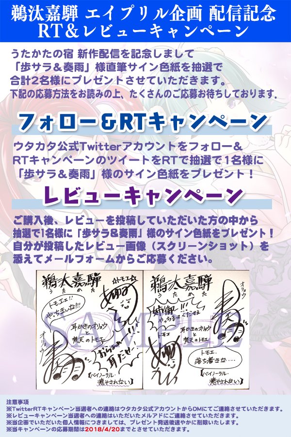 ウタカタアカウントをフォロー&このツイートをRTにて歩サラ様&奏雨様のサイン色紙を抽選で1名様にプレゼント!(3/20〆)