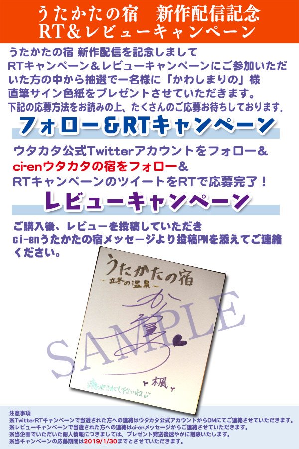 【うたかたの宿配信記念!秋の長月フォロー&RTキャンペーン】 ウタカタアカウントをフォロー&このツイートをRTにて歩サラ様のサイン色紙を抽選で1名様にプレゼント!(11/17〆)10%OFFキャンペーン中! dlsite.jp/mawtw/RJ209371 #DLsite割引