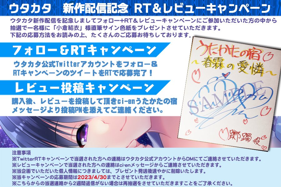 ✨ウタカタアカウントをフォロー&このツイートをRTしてくださった方とレビュー&ci-enでイイネご応募の方の中から抽選で一名様にかわしまりの様直筆サイン色紙をプレゼント!詳しくはci-en該当記事をご覧下さいdlsite.jp/mawtw/RJ237729
