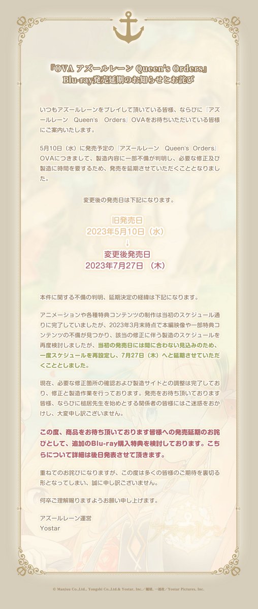 指揮官の皆様、ならびに関係者の皆様にはご迷惑をおかけし、大変申し訳ございません。