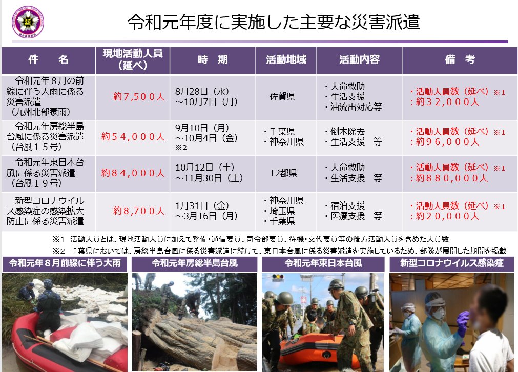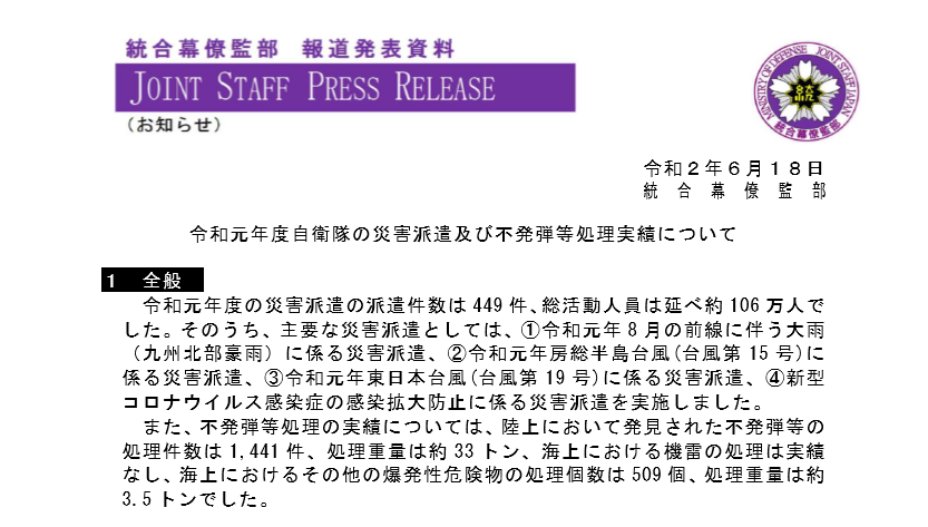 令和元年度自衛隊の災害派遣及び不発弾等処理実績について