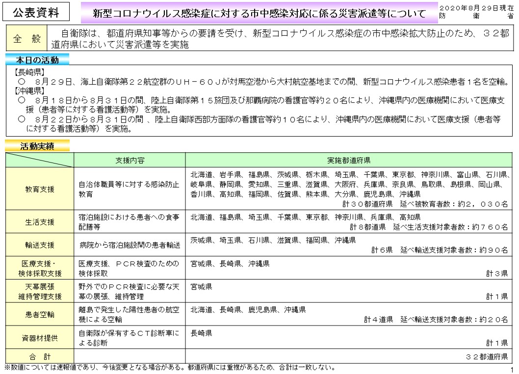 8月18日から31日までの間、自衛隊は、沖縄県において新型コロナウイルス感染症に係る災害派遣を行いました。今後も、沖縄県と緊密に意思疎通を図るとともに、更なる要請があった場合には、関係省庁等と緊密に連携して、しっかりと対応いたします