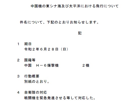 中国機の東シナ海及び太平洋における飛行について