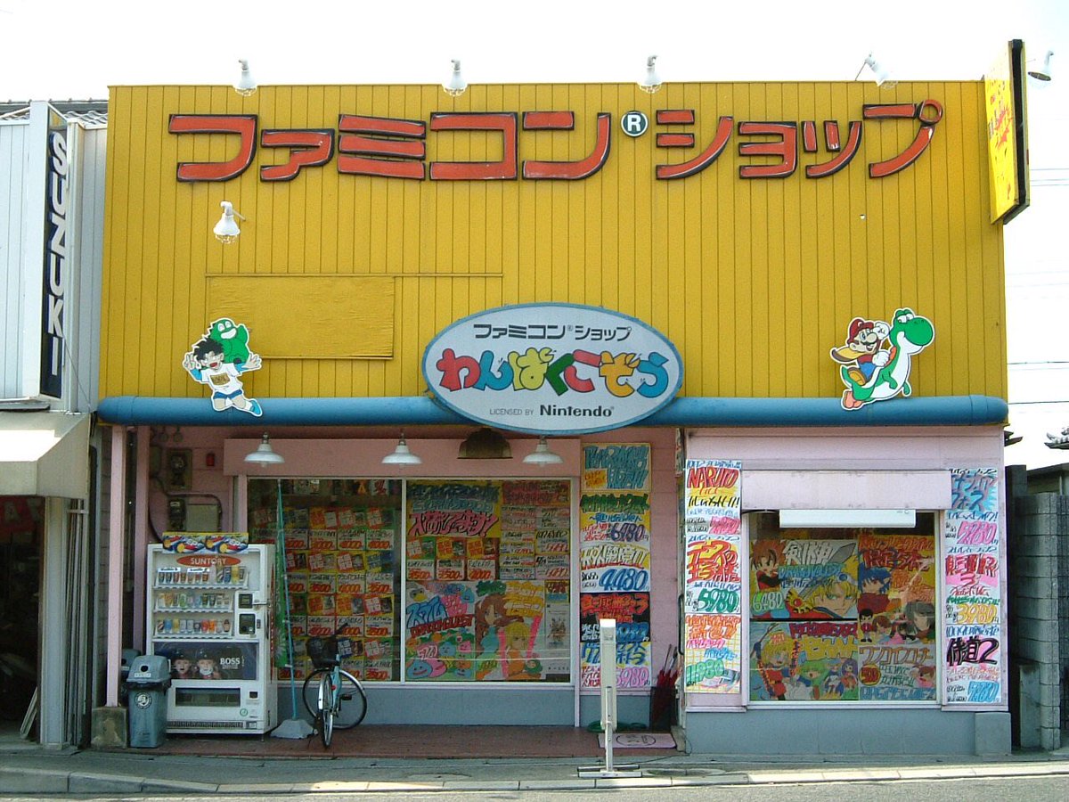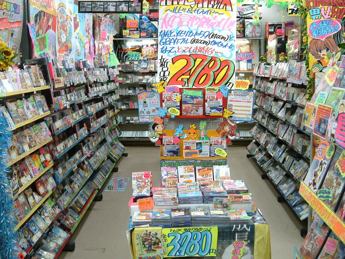 昔のゲームショップを懐かしむシリーズ⑦ 2003年頃の高倉台店です。手書きPOP職人の技が光ってました。余談ながら看板の少年と怪獣の名前は、ゆーたとジーラって言います😁