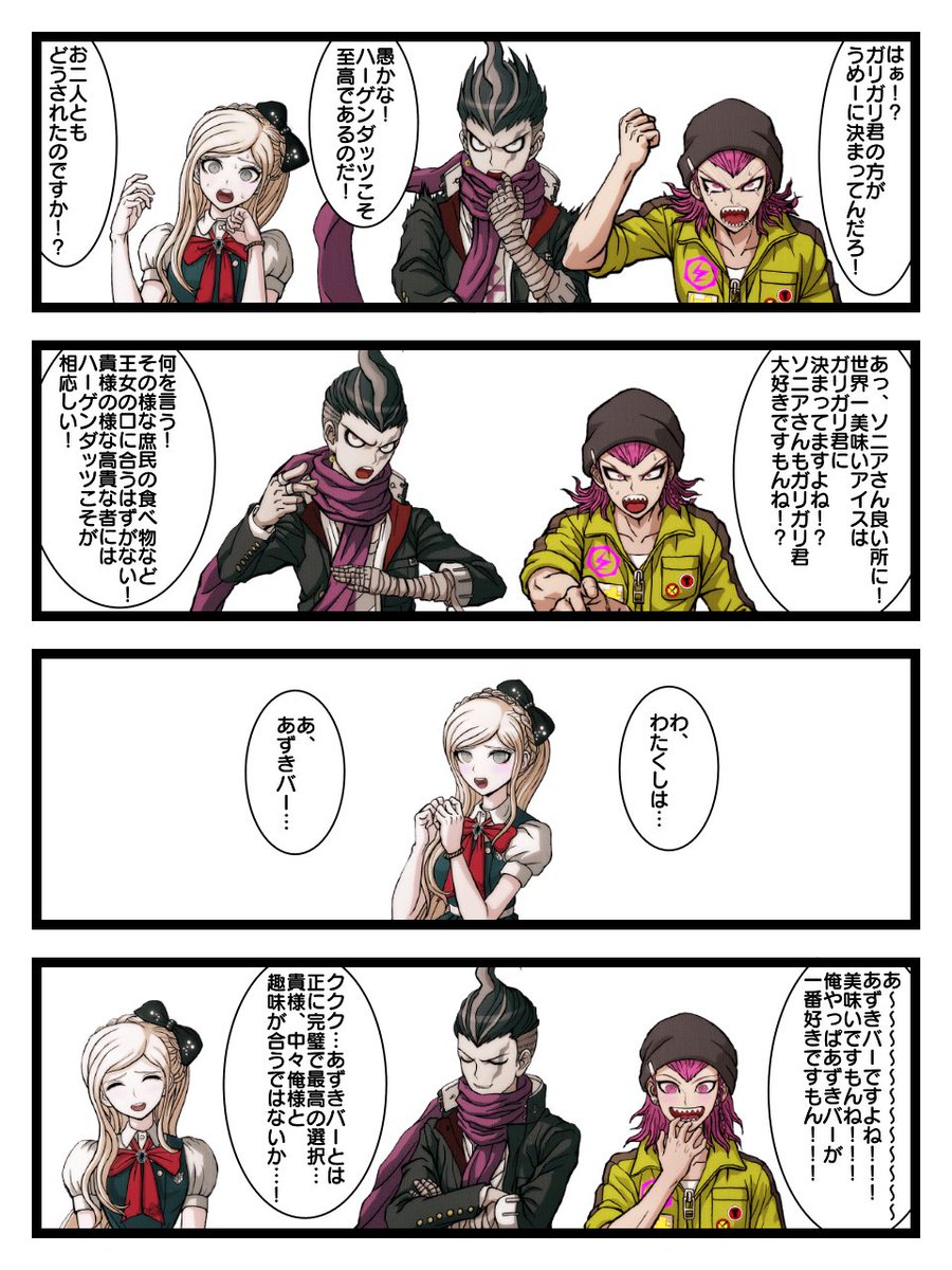 #midjourney っていう画像生成AIがあるらしくて早速ニューダンガンロンパV3のキャラ16人の名前を入れてみたら王馬と是清あたりはまぁギリ似てるかなぐらいのレベルだったんだけどゴン太と斬美の名前を入れた瞬間とんでもない超絶神絵が生成されちゃったからビビって泣いてる