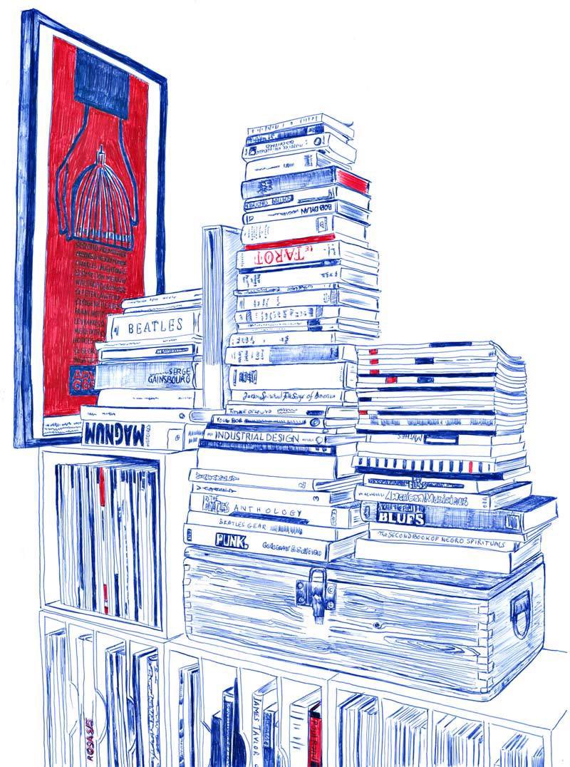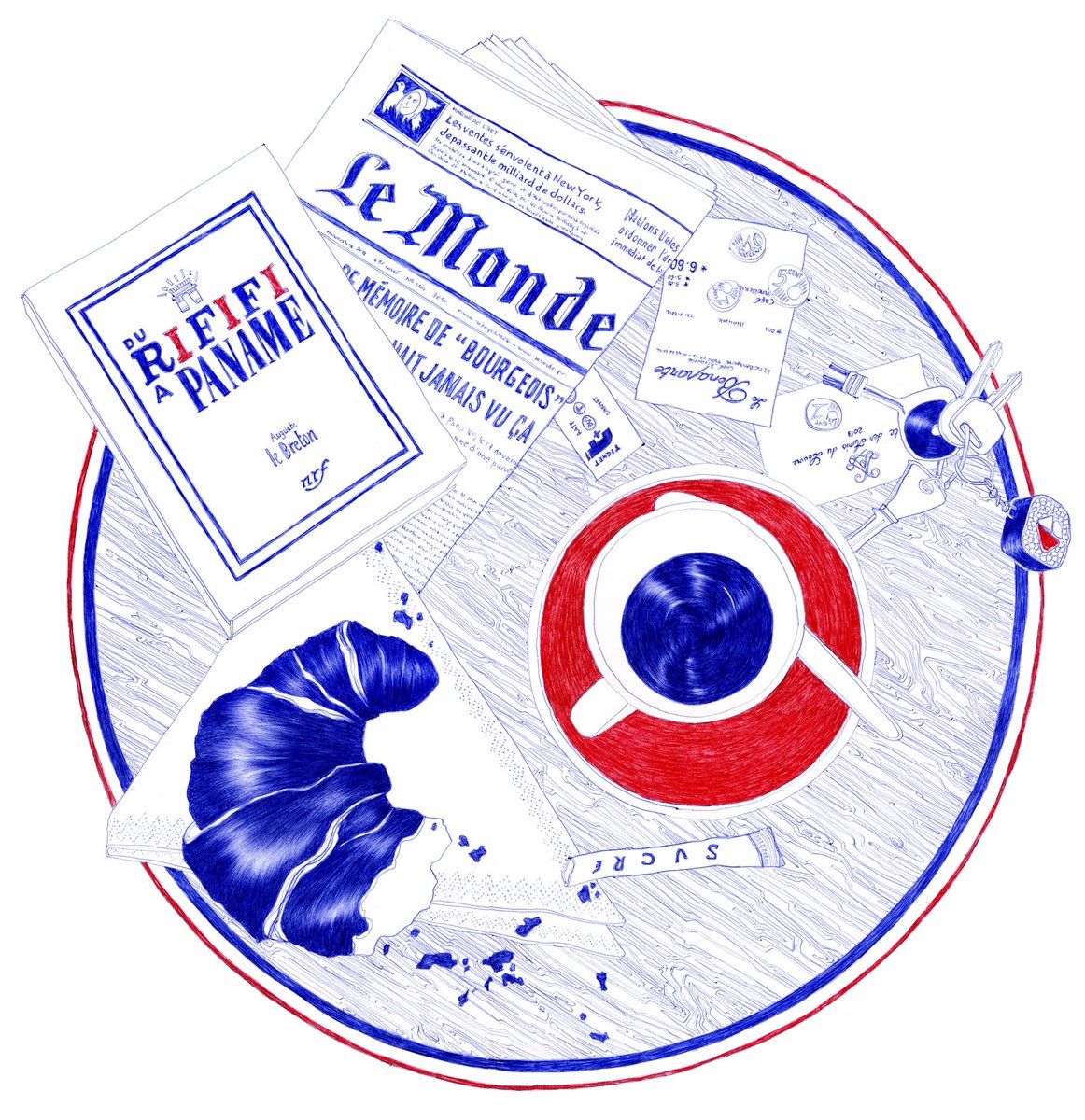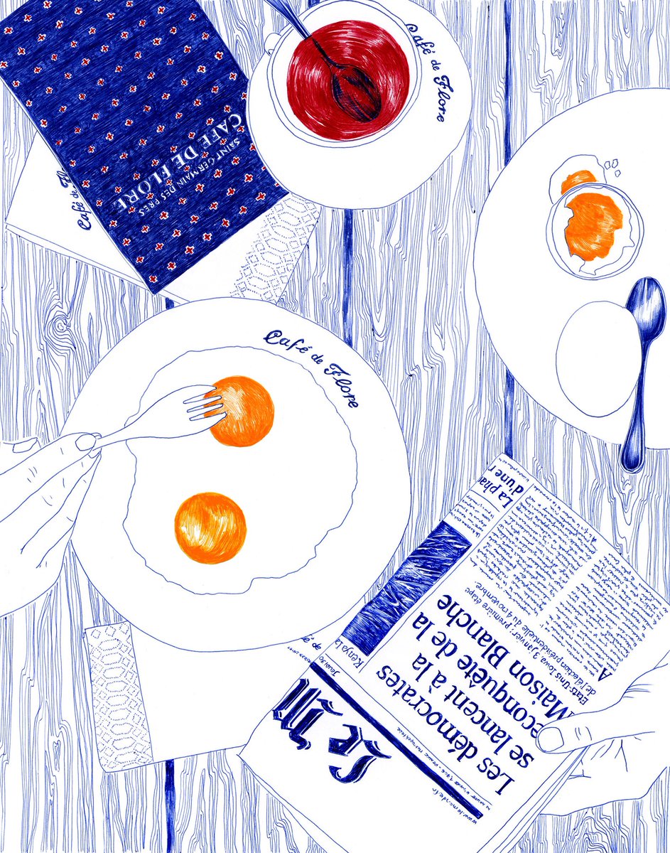 코발트블루라는 말보다 파란볼펜색, 파란잉크색이라고 부르게 되는 익숙하고 친숙한 색인데 (진짜 볼펜에 파랑 빨강, 사무적 조합) 통으로 파랗게 그리니까 멋지고 시크하다, 시원스러워진 사물들