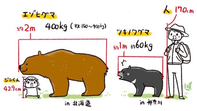 ちなみにツキノワグマとエゾヒグマのサイズ差はこんな感じ ┐ξ(・ω・┐)3 twitter.com/prefhokkaido/s…