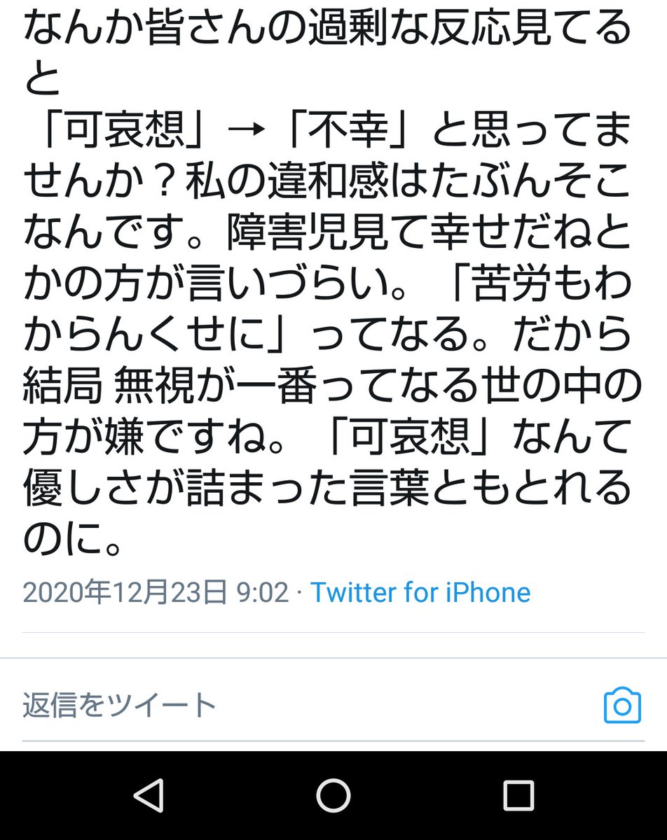 病院で次男とお喋りしてたら「うちの孫はもっと上手にお喋りするけど障害があるの?かわいそうに」って言われたから「障害があるけど、何かできない子のことをいきなりかわいそうって言ったりしないし、かわいそうな子ではない」って言い返したぞ。後から涙が出たし心臓がバクバクしてる。頑張った自分