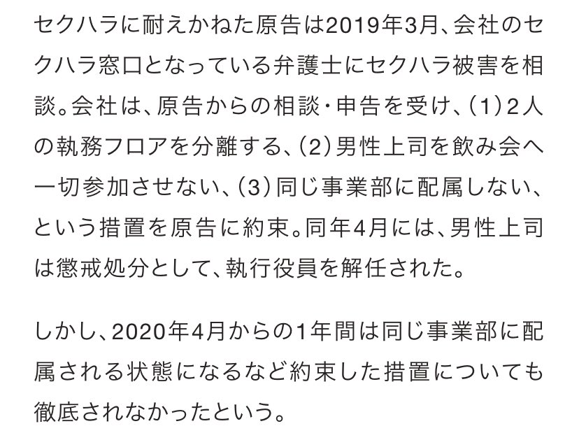 ニュースに戻って時制を確認したが、「2019年3月の弁護士へセクハラ被害相談し会社は対応措置を約束したが2020年4月から1年間は同じ事業部に配属、措置が徹底されなかった」じゃん…