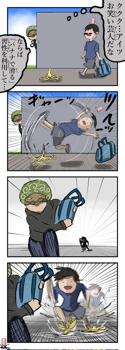 バナナで滑る人。