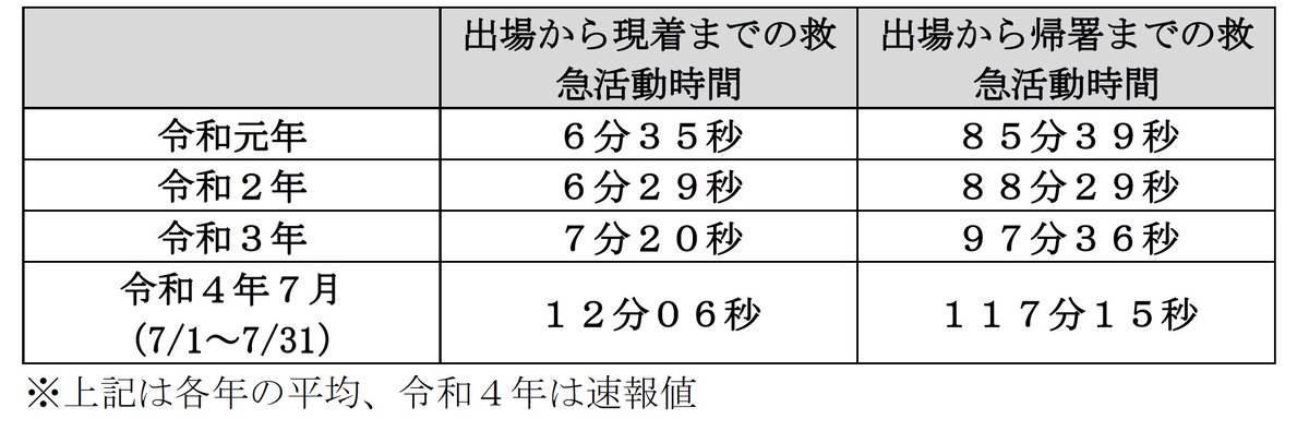 今年7月(速報値)の救急車の到着までの平均時間は12分6秒となっており、2019年や20年の倍近い(…)同庁はこうした逼迫した状況について、「命を救うために、本当に救急車が必要な人が救急車を利用できるよう、救急車の適正利用にご協力をお願いします」と呼びかけた。
