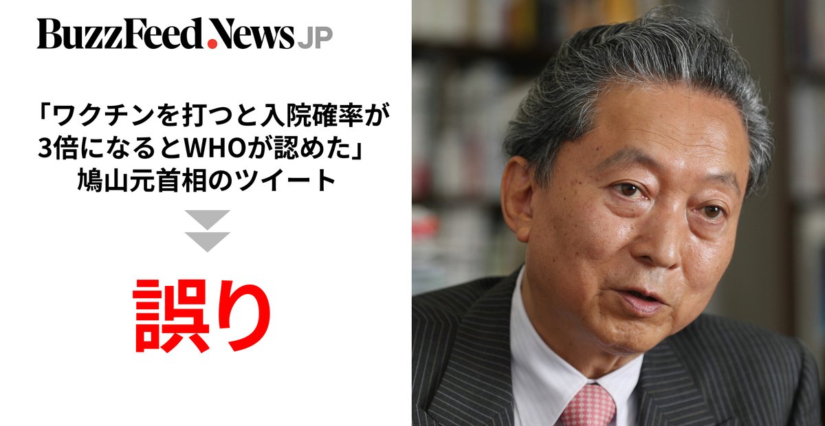 「ワクチンを打つと入院確率が3倍になるとWHOが認めた」鳩山元首相のツイートを専門家が否定。河野太郎氏は「ワクチンデマ」と批判