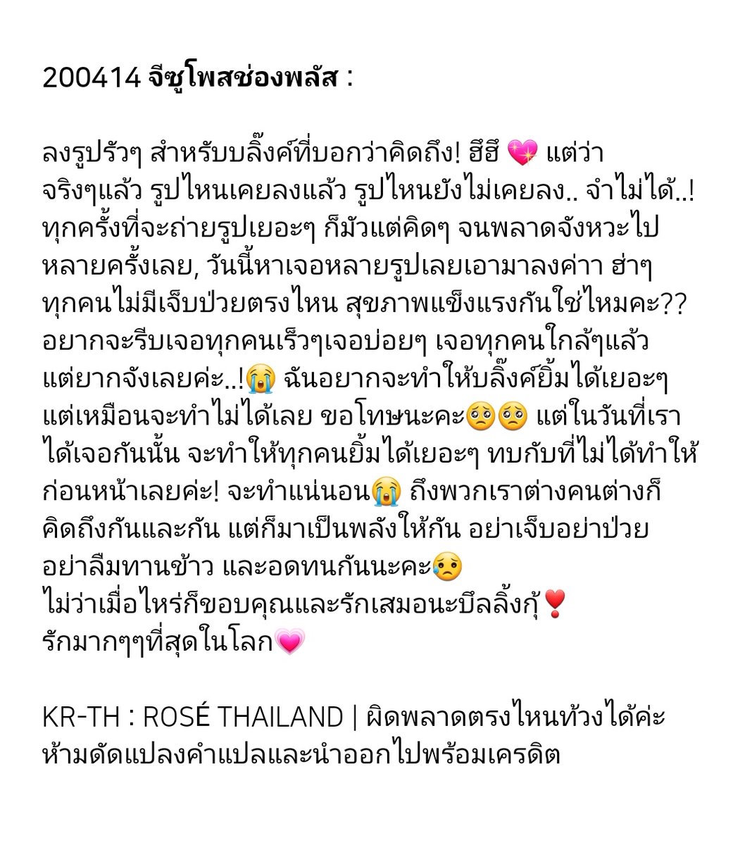 [IG] 200407 roses_are_rosie's IG story : (แคปชั่นภาษาอังกฤษ) Hi blinks, I miss u and I hope you're all doing good🤍 (แคปชั่นภาษาเกาหลี) บลิ๊งค์สบายดีกันหรือเปล่าคะ? คิดถึงจังเลยค่า~ ดูแลสุขภาพกันด้วยนะคะทุกคน🤍