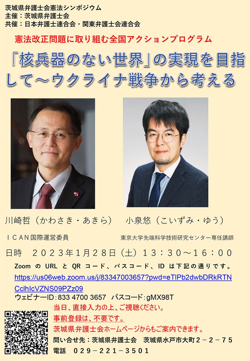 ICAN国際運営委員・川崎哲(ピースボート)と、東京大学先端科学技術研究センター専任講師・小泉悠さんが登壇します。参加無料、事前登録不要です。ぜひご参加ください。