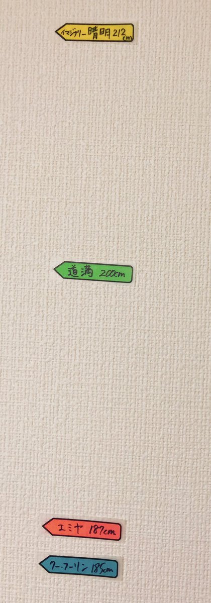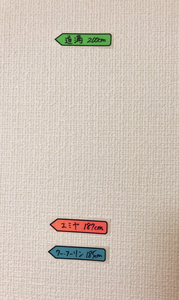 歩いてて2mの男のイメージつかなかったから実感持つために槍弓と晴道の身長測ってみた☺️ き、黄色いのは、玉藻が「日本人の骨格じゃない」って言うから…!