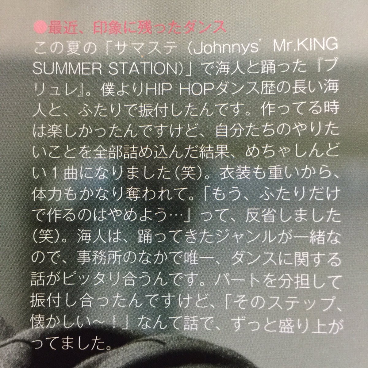 機構トラブルといえば、2017ハピアイで2幕開演が遅れて黒スーツのMr.KINGが「皆様にお伝えしなければならないことが」なんて言うから帝劇中が異様な空気に包まれる中、「お餅にほうれん草とか絡まった味噌汁みたいなやつ」「お雑煮な」って一瞬でいつもの空気を取り戻したしょうれん芸、一生忘れない