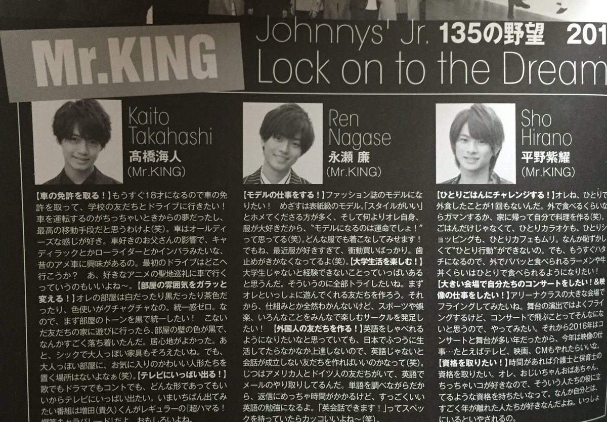 スゲェ...ここに来て「Princeは素敵なグループで大切だけど僕達は結局ジャニーズJr.個人」と言い切ったPrinceと、「個人の仕事もグループに還元したい」Mr.KING、、イメージ的には個のキング集団のプリンスなのに実際はそれぞれ真反対の発言なのが最高にゾクゾクするキンプリ