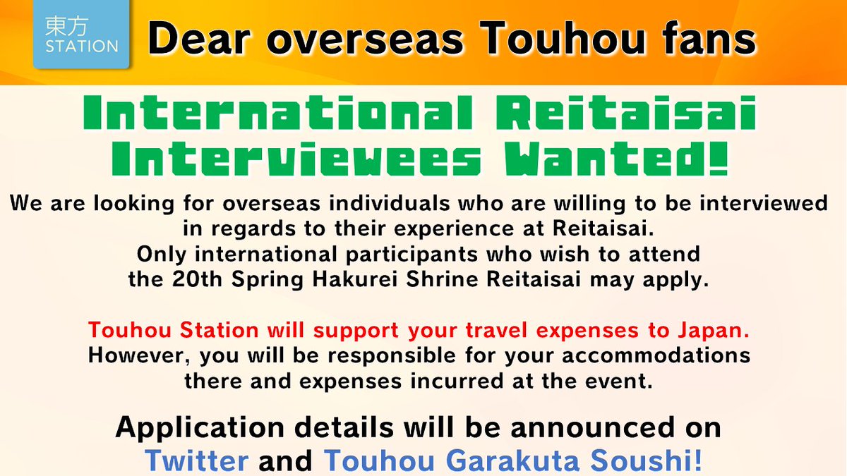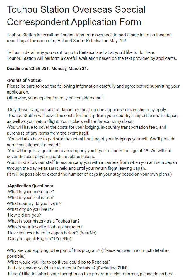Touhou Station is recruiting Touhou fans from overseas to participate in its on-location reporting at the upcoming Hakurei Shrine Reitaisai on May 7th!