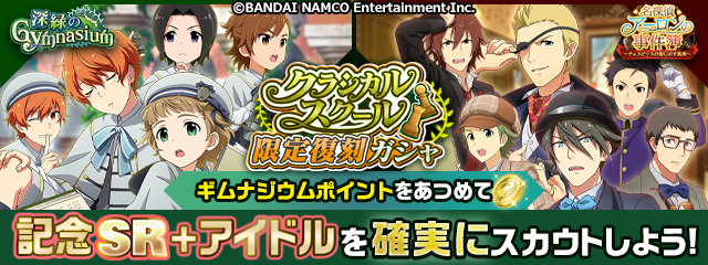 「深緑のGymnasium」に出演したアイドルの皆さんの「記念SR+」や前作のフルボイスストーリーが確認できますよ。