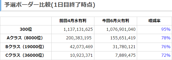 【グラブル】2020年6月古戦場予選ボーダー予想予選1日目終了時点 全ボーダー前回よりペースダウン、Aクラスは5.7億ペース