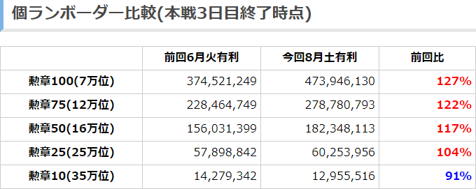 【グラブル】2020年8月古戦場個人ランキングボーダー予想/本戦3日目終了時点 16万位以上が大幅にペースアップ、7万位は6.8億超えるペースだが7億超えの可能性もあるか