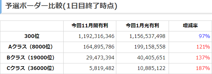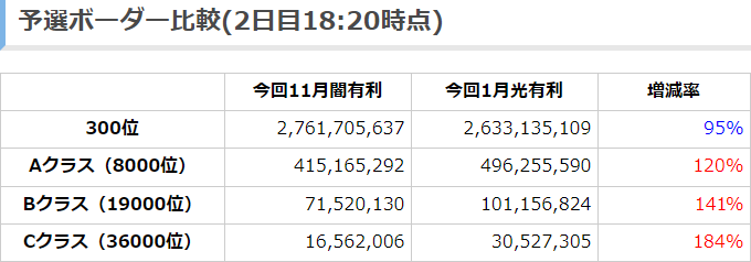 【グラブル】2020年11月古戦場予選ボーダー予想予選2日目18:20時点 1日目終了時点に比べて300位は横ばい、Aクラス以下は伸びが鈍化、Aクラスは6.6億前後になりそうか