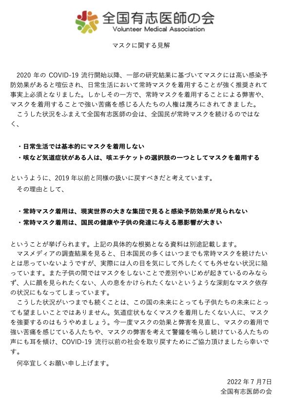 マスクに関する見解と資料を全国有志医師の会のホームページに掲載しました。
