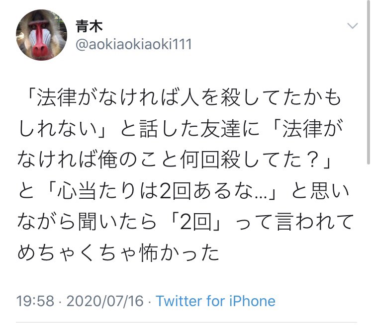 「法律がなければ人を殺してたかもしれない」と話した友達に「法律がなければ俺のこと何回殺してた?」と「心当たりは2回あるな…」と思いながら聞いたら「2回」って言われてめちゃくちゃ怖かった