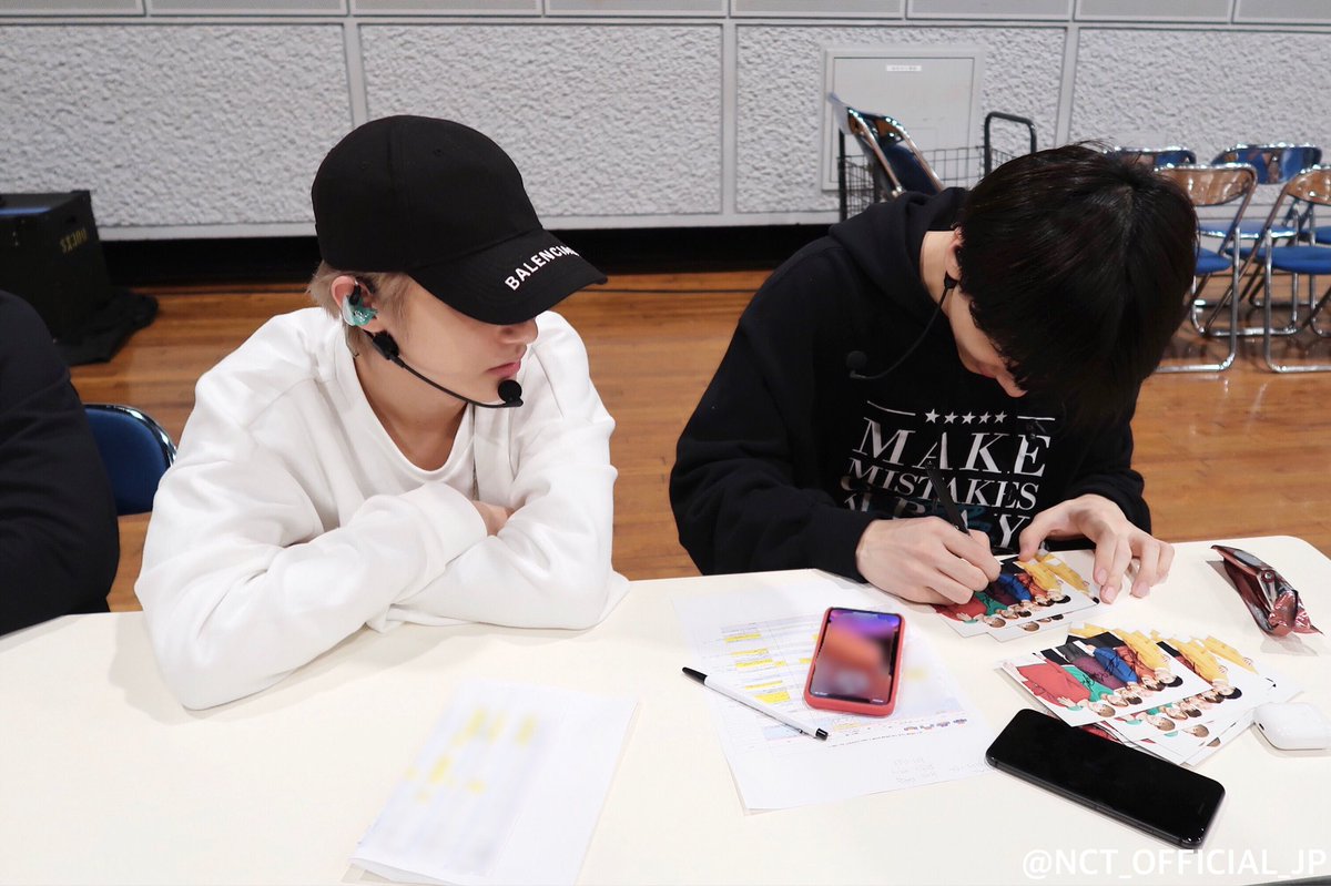 プレゼント用のポストカードにサインするチソンと順番待ちするロンジュン📸