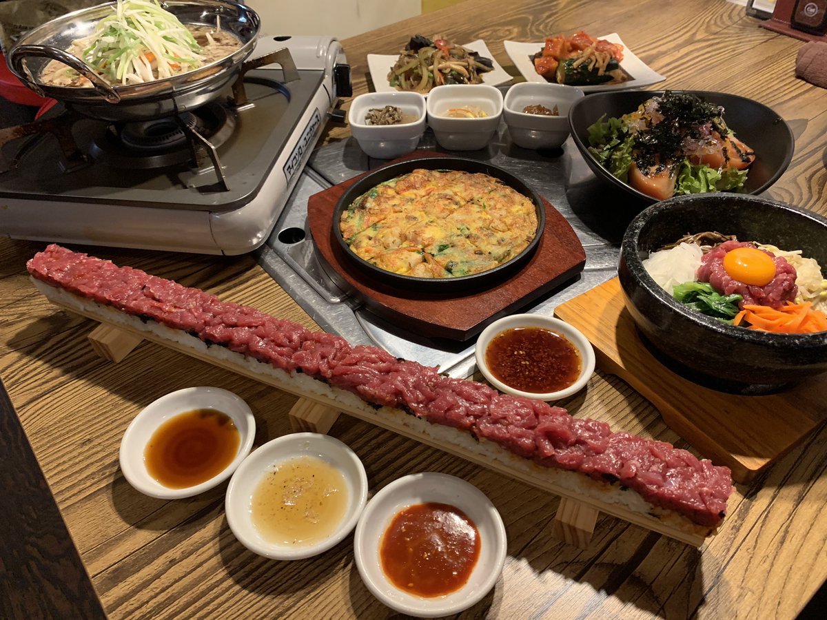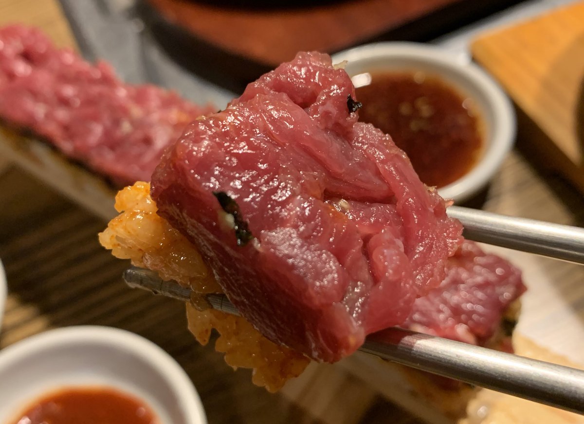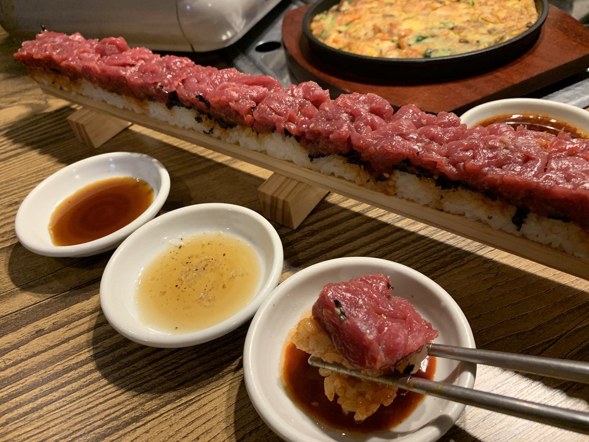 まじでこの世の全てのユッケ好きに教えてあげたいんだが飯田橋の【味韓】には全ての人間を虜にする禁断の51センチ和牛ローストビーフ風ユッケ寿司がある。