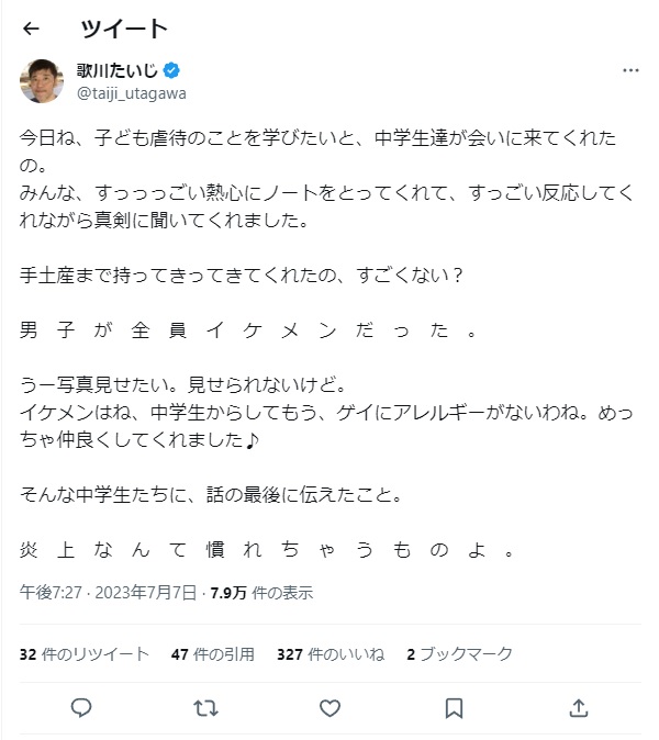 ゲイ活動家のあなたは、その男子中学生たちの講師役であり、よそさまの大切な息子さんと接しているというご自覚はありましたか? 彼らはあなたにとって「男子中学生」という記号でしかなく、同好の士(同性愛者)への自慢の種でしかない思われても仕方のない発言だったと、ご自分でも思いませんか? twitter.com/taiji_utagawa/…