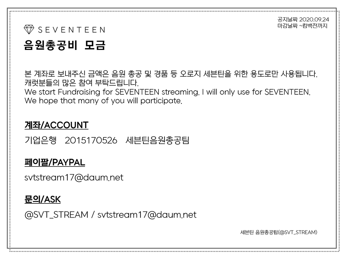 보내주신 금액은 오로지 세븐틴과 관련된 활동만을 위해 사용되오니 캐럿분들의 많은 참여 부탁드립니다.