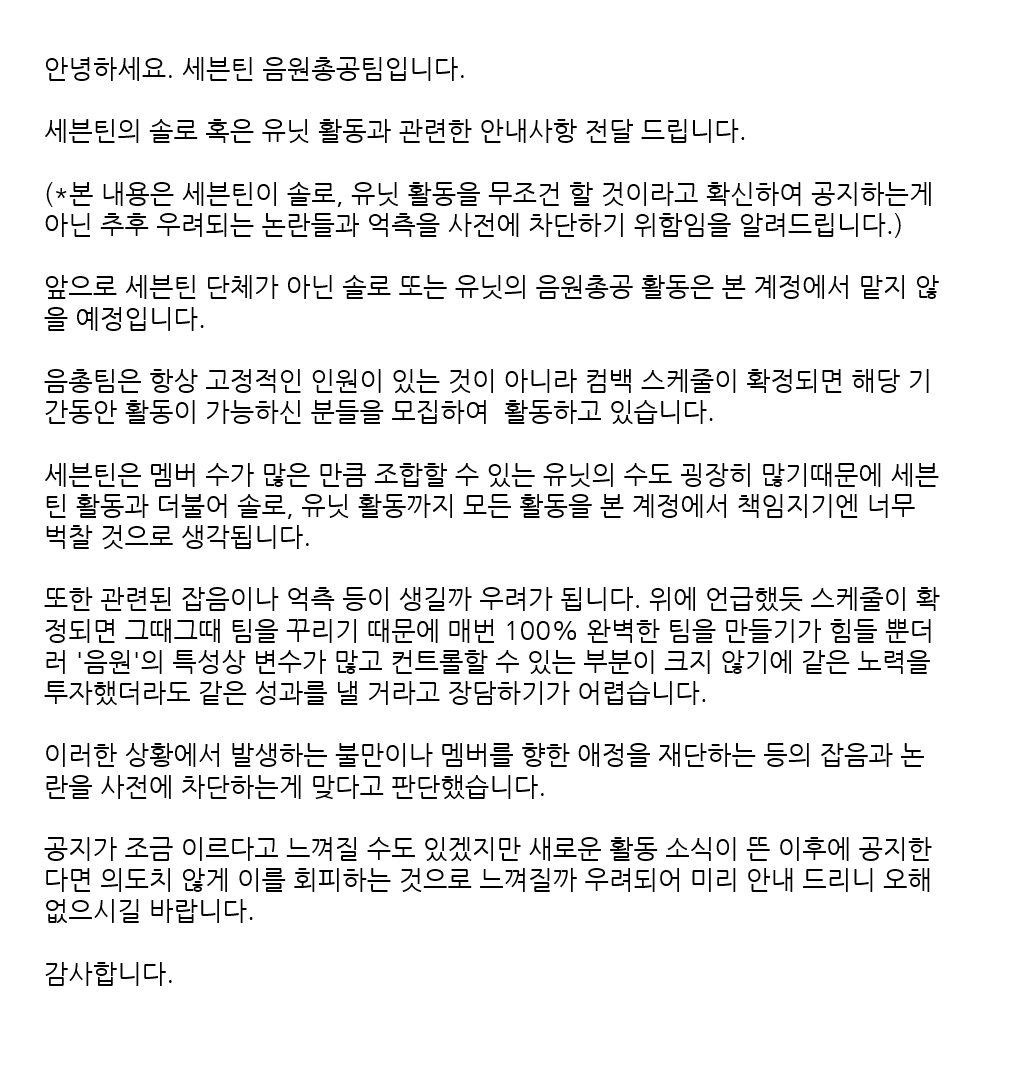 세븐틴 정규 4집 활동을 함께할 음원총공팀을 모집합니다. 각 지원 분야별 공고를 잘 확인하시고 지원 방법에 맞추어 지원해주시기 바랍니다. 많은 지원 부탁드립니다.