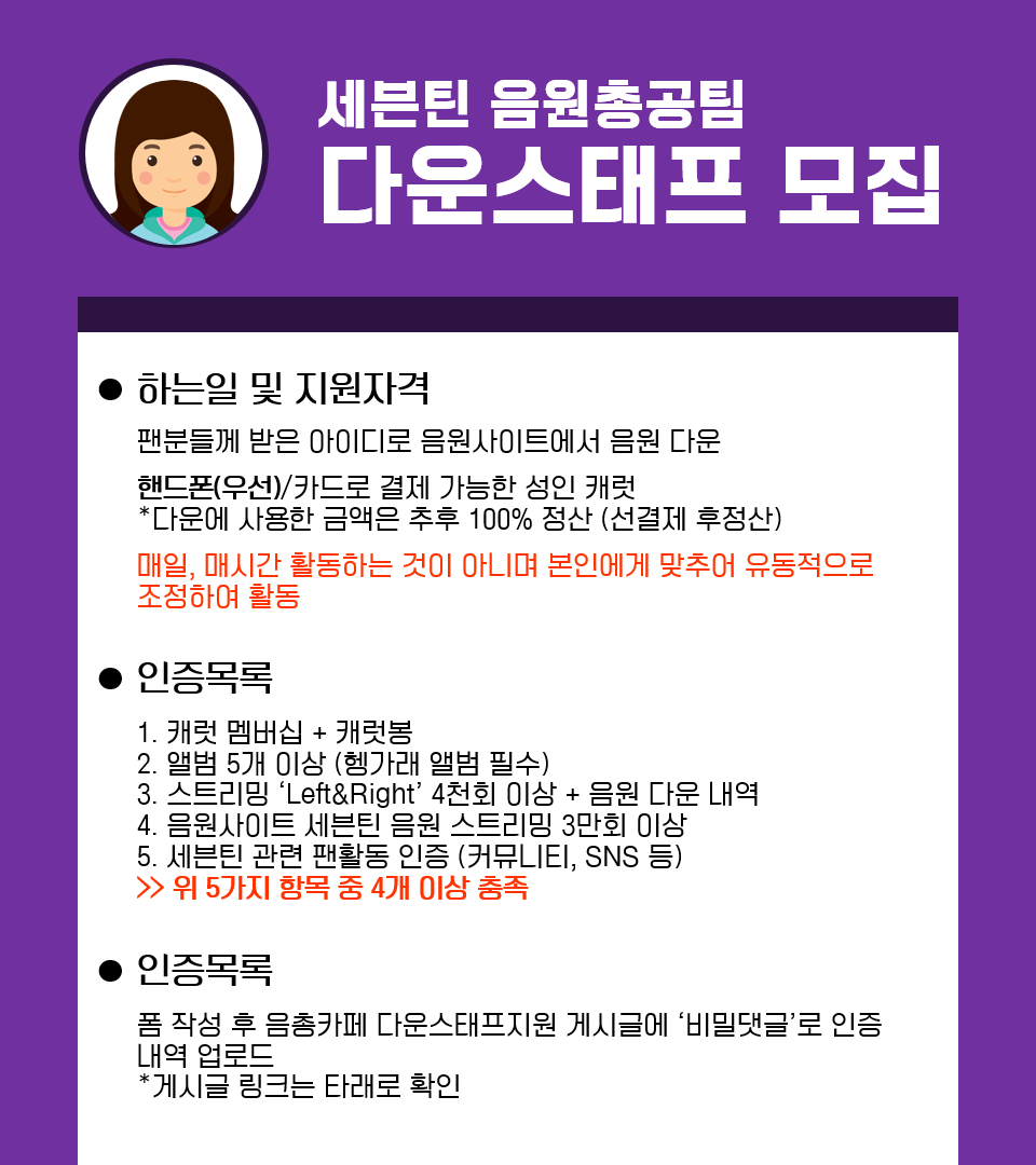 이번 활동 함께해주실 다운스태프를 모집합니다. 다운스탭이 없으면 총공 진행이 불가능합니다. 아래 사진을 잘 읽고 가능하신분은 '다음총공카페'에서 지원 부탁드립니다. #세븐틴 #SEVENTEEN