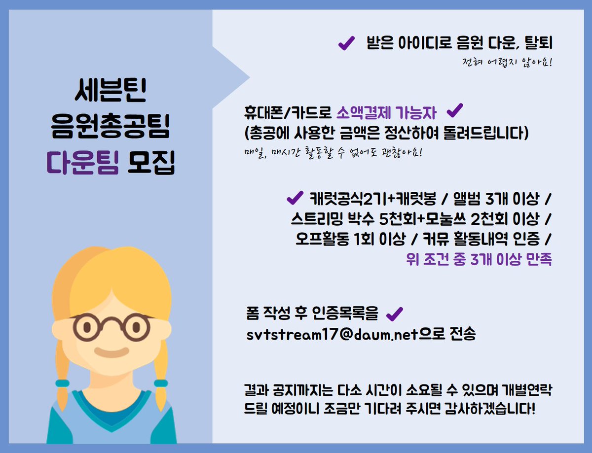 세븐틴 음원총공팀 다운팀을 모집합니다. 지원자분들께서는 인증항목을 svtstream17@daum.net 으로 보낸 후 폼 작성 부탁드립니다. 캐럿분들의 많은 관심과 지원 부탁드립니다. #세븐틴 #SEVENTEEN