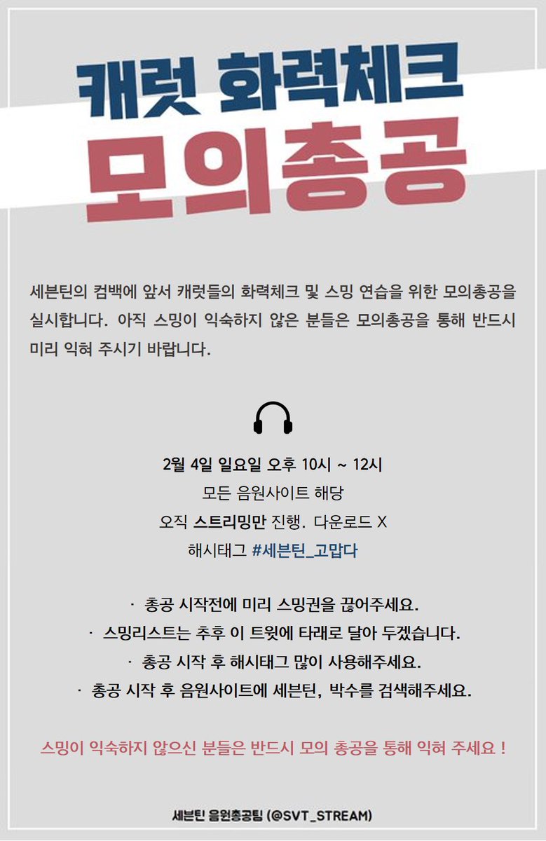 컴백 전 캐럿들의 화력체크 및 스밍연습을 위해 모의총공을 진행합니다. 아래 내용을 잘 읽고 많이 참여해주시기 바랍니다. 모의총공용 스밍리스트는 추후 본 트윗의 타래로 공지하겠습니다. #세븐틴 #SEVENTEEN