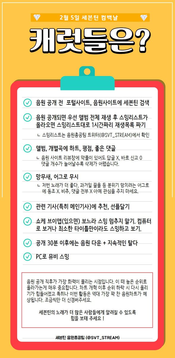 사진 속 내용을 잘 읽고 미리 숙지해주세요! 스밍, 뮵밍은 물론 기사 댓글 음원사이트 댓글, 평점도 중요합니다! #세븐틴 #SEVENTEEN