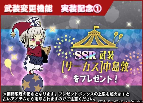 【お知らせ】「武装変更」実装を記念して、全ユーザー様に「SSR武装[サーカス]中島敦」をプレゼント!