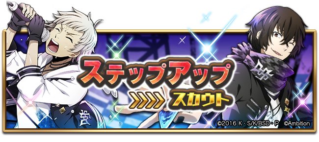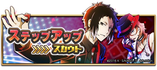 こちらはポートマフィア版のステップアップスカウト♪STEP3、5でSSRキャラクター1体確定、STEP6以降はSSR出現率1.5倍で何度でもご利用いただけます。 #bungomayoi