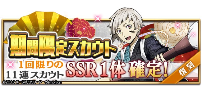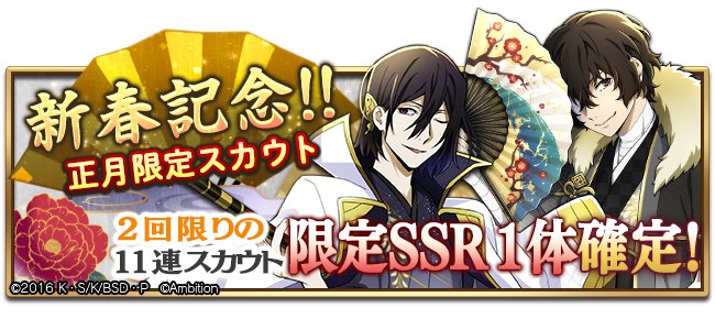 こちらは昨年登場した SSR [正月]キャラクター4人のうち、いずれか1体が確定で獲得できる11連スカウトです! #bungomayoi