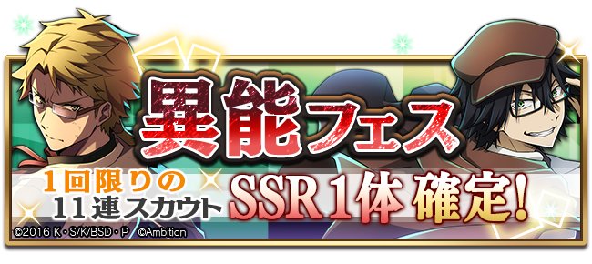 今回は過去に登場した異能フェス限定キャラクターのうち「SSR[閃光榴弾]国木田独歩」と、「SSR[名探偵]江戸川乱歩」の出現率が上昇しています♪ #bungomayoi