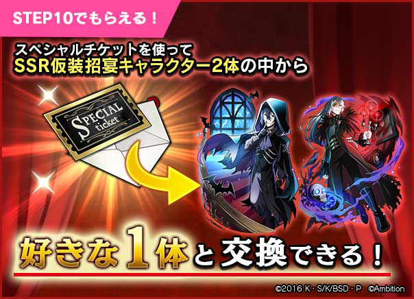 STEP10で「SSR[仮装招宴]フョードル・D」「SSR[仮装招宴]澁澤龍彦」のどちらかを選択して交換できる「スペシャルチケット」が入手可能なステップアップスカウト!