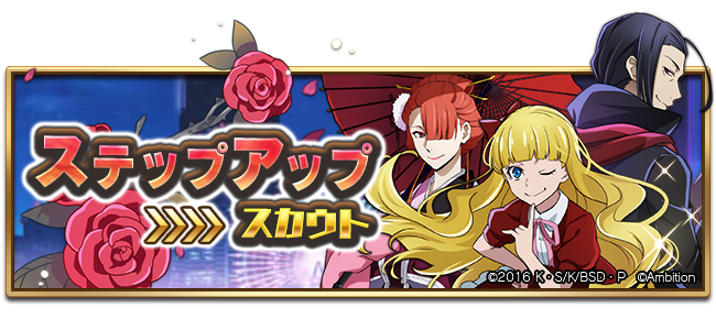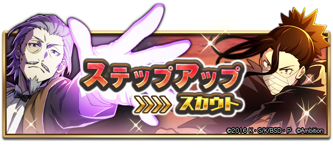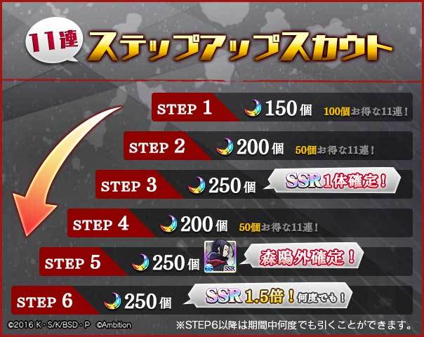 STEP3でSSRキャラクターが1体確定、STEP5で「SSR[冷徹な首領]森鴎外」を確定で入手できるステップアップスカウトです♪