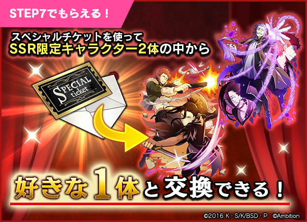 STEP7で「SSR[黒蜥蜴]銀」「SSR[黒蜥蜴]広津柳浪」のどちらかを選択して交換できる「スペシャルチケット」を入手可能!