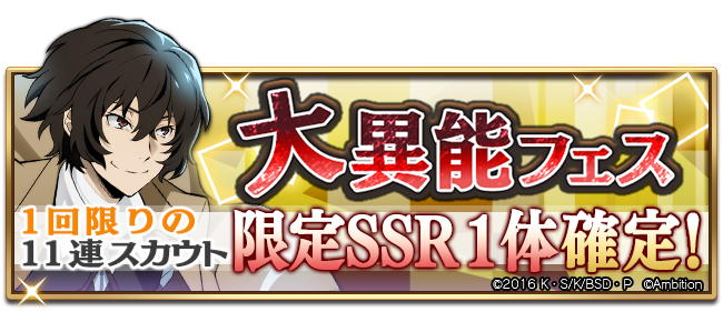 「大異能フェス」ではSSR出現率が2倍にアップしているほか、「SSR[戦略家]太宰治」の出現率もアップ♪ #bungomayoi