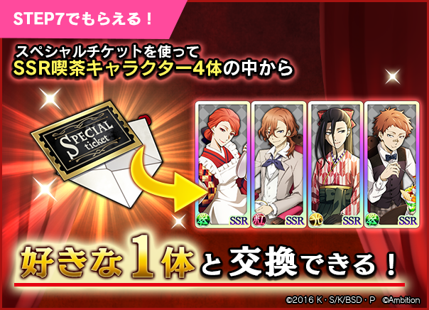 STEP5でSSR[喫茶]キャラクターの中からいずれか1体が確定、さらにSTEP7ではSSR[喫茶]キャラクターから1体を選んで入手可能な「スペシャルチケット」を獲得できるステップアップスカウトです♪ #bungomayoi