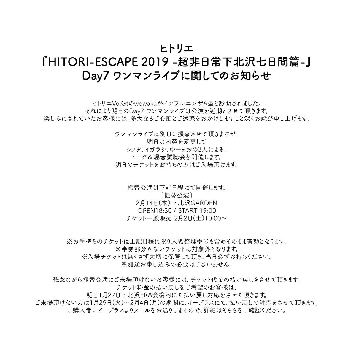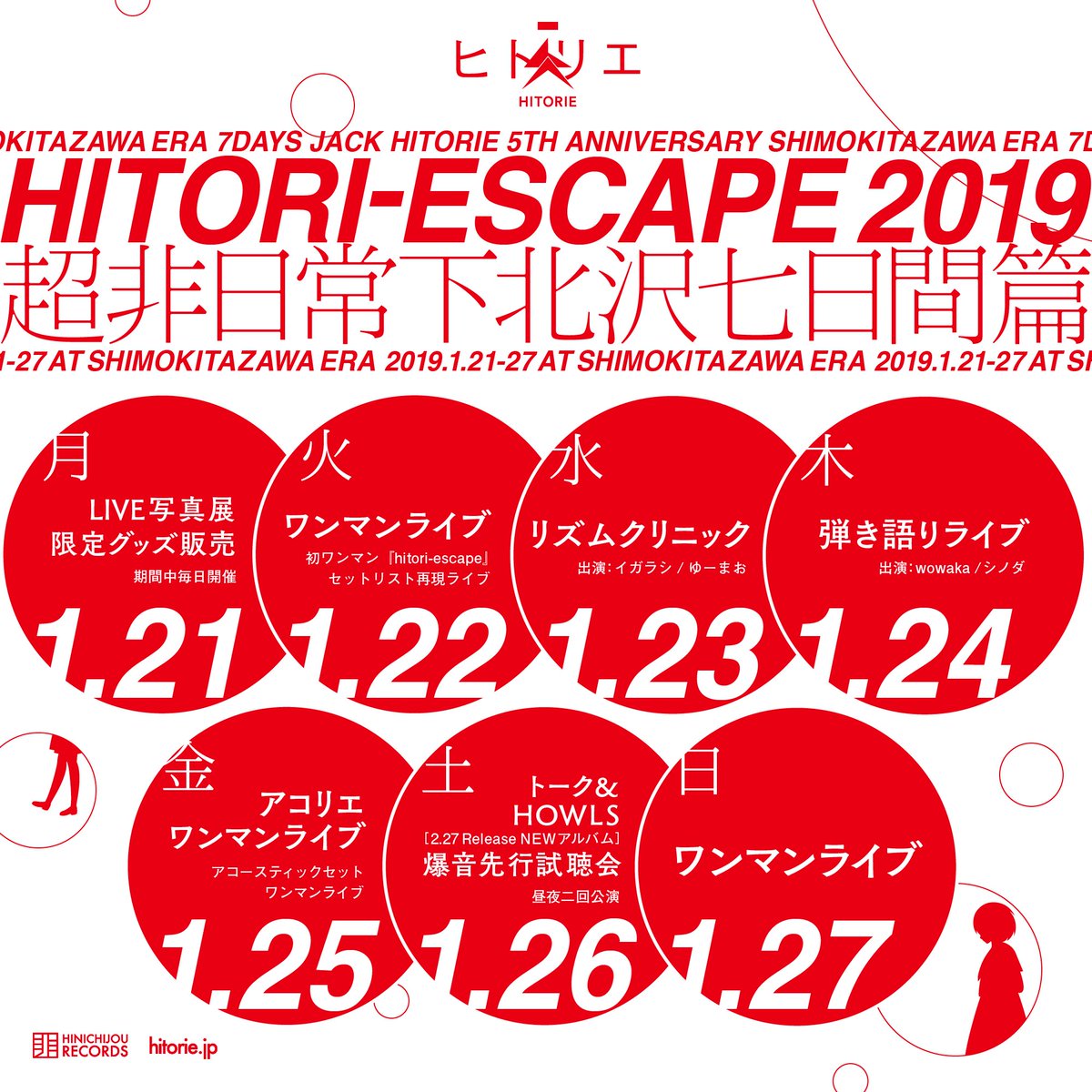 2019年1月、デビュー5周年を記念して、ヒトリエ初ワンマン『hitori-escape』開催の地"下北沢ERA"を7daysジャック。