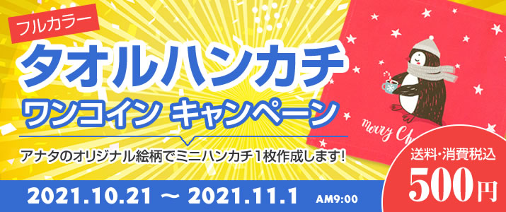 今回、「フルカラータオルハンカチ」の取り扱い開始を記念しまして1枚500円(送料/税込)、ワンコインで作れるキャンペーンをおこないます♪