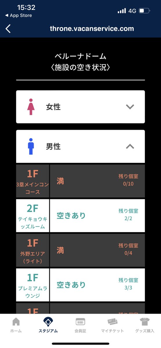 10thのとき西武ファンに教えてもらったんですが、ライオンズの公式アプリ入れておけばベルーナドームのトイレの混雑状況がわかるらしいです #cgコンステ_day1