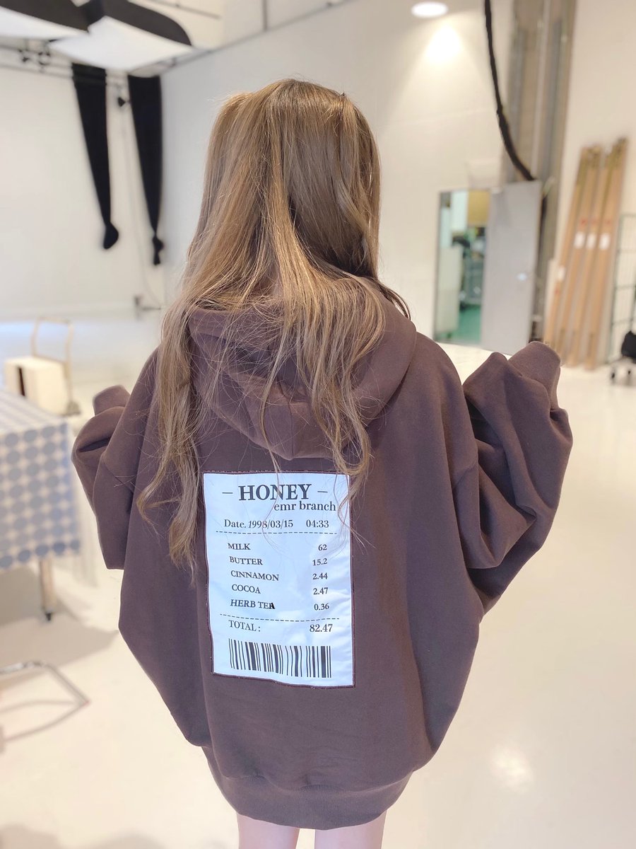 お家でもハニシナさんのコラボパーカー!さっき撮ったよ🍓噛んじゃって反省のかお